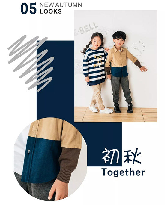 LOOK5 : 很都市感的一组CP组合,经典不败的蓝白条中长款抓毛卫衣+搭配简约卡其裤,而BOY灯芯绒毛织的拼接细节,体现设计师的小心机,凸显孩子们轻松随性的穿着态度。