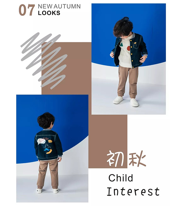 LOOK7 : 帅气牛仔立领夹里外套,充满童趣的印花是款式亮点,搭配打基布针织束口长裤,个性时尚LOOK。