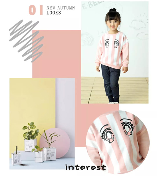 LOOK1:间条落肩圆领卫衣,柔软舒适。流行的眼睛印花平面,可爱不失时尚+搭配针织弹力裤,GRIL散发活力满满。