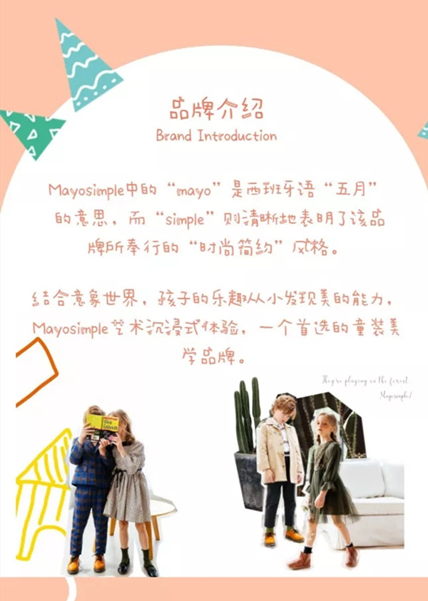 五月童品是一间专为1-12岁儿童形象精心打造的品牌童装店。品牌主张轻奢主义 & 休闲随意。Mayosimple中“mayo”是西班牙语“五月”的意思,而“simple”则清晰地表明了该品牌所奉行的“简约”风格。