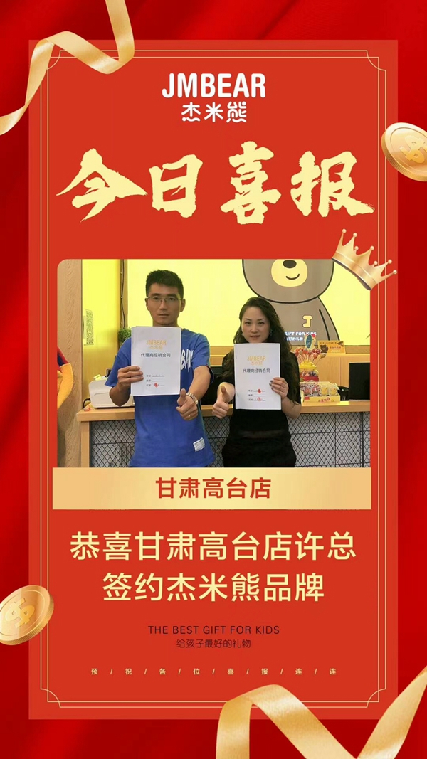 在这黄金时节的九月,JMBEAR杰米熊再出新地标!恭喜甘肃高台杰米熊高效店铺即将精彩亮相!同时也感谢甘肃高台店的许总对于杰米熊的信任!预祝事业蒸蒸日上!