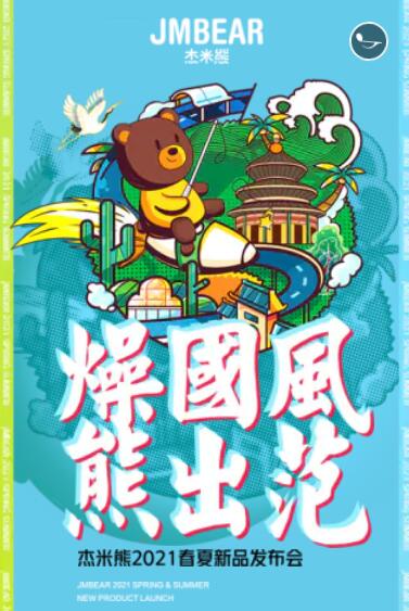 燥国风,熊出范,杰米熊2021春夏新品订货会,将于2020年8月25号登陆福建杰米熊总部召开!2021杰米熊春夏新品发布会,以“燥国风,熊出范”为主题,燃燥中国力量,共创中国风范!